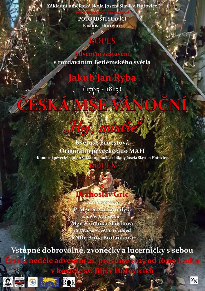 s rozdáváním BETLÉMSKÉHO SVĚTLA, který se uskuteční o čtvrté neděli adventní 21. prosince 2025 v 16 hodin v kostele sv. Jiljí v Hořovicích na Víseckém náměstí. V závěru Rybova roku zazní jeho ČESKÁ MŠE VÁNOČNÍ „HEJ, MISTŘE“.