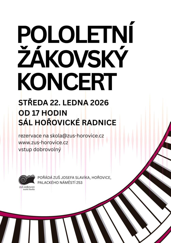 Zveme vás na pololetní žákovský koncert, který se uskuteční ve středu 22. ledna 2026 od 17 hodin.